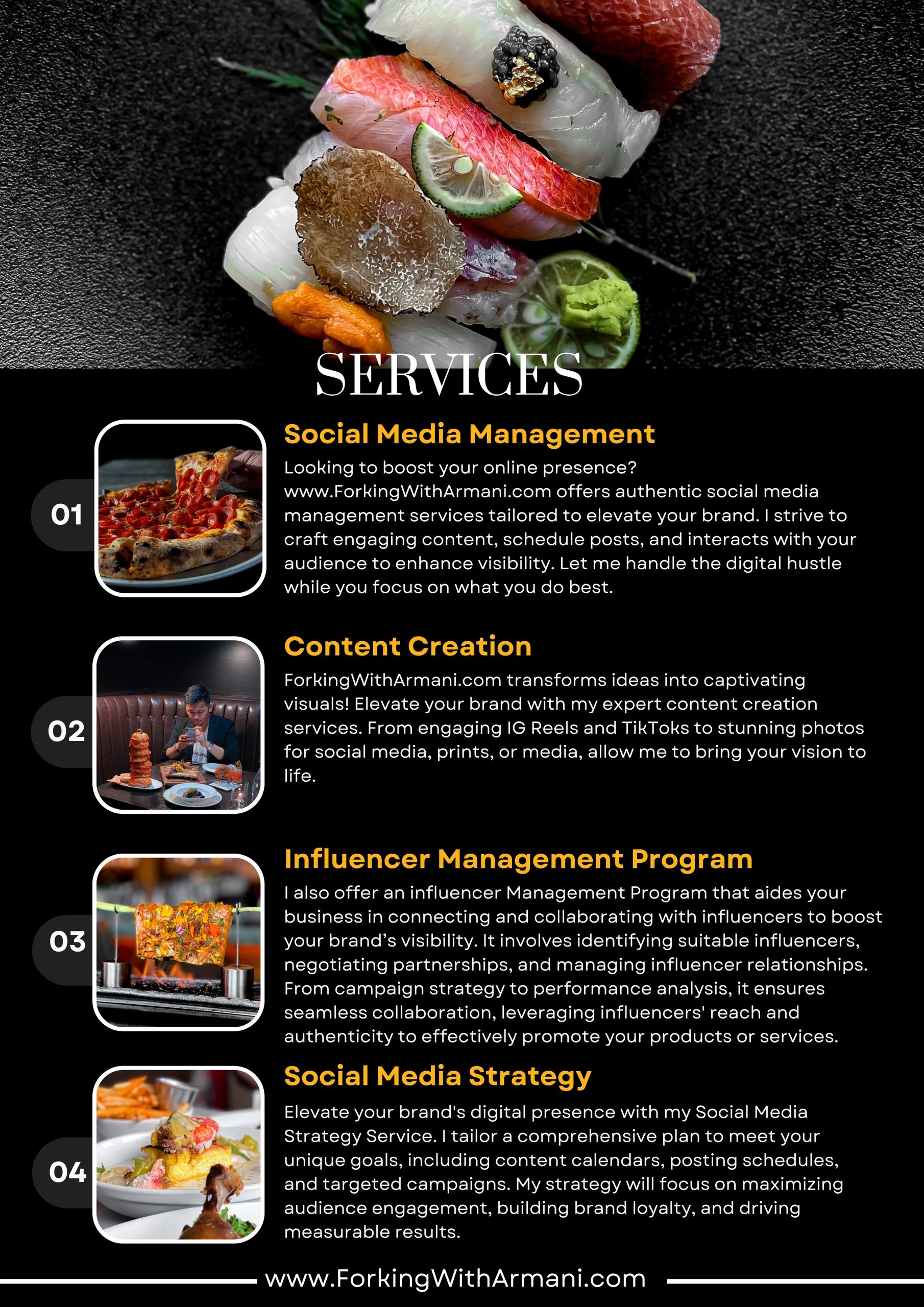 In the realm of social media management, ForkingWithArmani, LLC emerges as an invaluable partner for businesses seeking to elevate their online presence. As a seasoned professional with a successful IG and TikTok (@ForkingWithArmani) boasting over 79k+ followers collectively, my services leverages my extensive experience in reaching millions of local accounts. By engaging ForkingWithArmani, LLC, clients benefit from my creative prowess, driving organic audience growth for their businesses. In addition, as a skilled content creator, I am able to transform clients' visions into visually captivating content, ensuring a compelling and effective online representation.